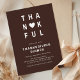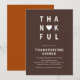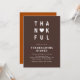 Célébrez la saison de la gratitude avec cette Invitation Thankful Modern Minimalist Thanksgiving Diner. Doté d'une typographie audacieuse avec un accent de coeur dans les tons chauds de l'automne, ce design propre et contemporain ajoute une touche élégante à votre réunion. Parfait pour un dîner Thanksgiving moderne, une fête d'Amical ou une fête d'automne, ce modèle éditable est facile à customiser et fait un gardien chic.