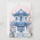 Cette invitation à la fête du thé a un design chinoiserie avec une pagode bleue et blanche sur un arrière - plan rose. La bordure voûtée a un motif de branche fleurie bleue sur un arrière - plan rose vif. Le dos a une grande pagode.