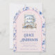 Cette invitation à la fête du thé a un design chinoiserie avec une soirée thé bleu et blanc sur un arrière - plan rose. La bordure voûtée a un motif de branche fleurie bleue sur un arrière - plan rose vif. L'avant et l'arrière ont un motif de coordination.