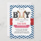 Thème de baseball Blue Chevron Stripes Red Ribbon C'est un garçon Baby Shower Invitations.