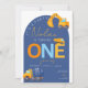 Construction première invitation anniversaire avec camions de construction avec pop d'orange, bleu et jaune.