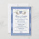Avoir un wedding shower de crabe ou de fruits de mer ? Voici un amusement, l'invitation brillamment colorée de thème de crabe qui s'adaptera juste dedans. Deux crabes bronzages stockant un texte bleu simple de coeur… a le manuscrit pour des noms et la douche plus facile de lire des polices pour les détails. L'arrière - plan est un beau contrôle bleu et blanc de guingan. Le texte d'invitation est encadré avec une coquille bleu-clair.