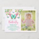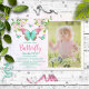 Invitations de fête d'anniversaire de fille à thème papillon doux et estival. Avec un beau bouquet de fleurs d'aquarelle et de papillons pastel, la photo de la fille d'anniversaire en plus de tous les détails de la fête.