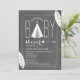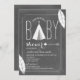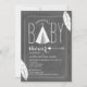 Une invitation moderne de baby shower comportant une illustration d'un tipi blanc de chevron, et flèche, et plumes. L'arrière - plan est tableau inspiré. Personnalisez le texte.
