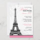 Invitations roses : Invitations élégantes et modernes de douches nuptiales parisiennes avec une tour Eiffel à l'échelle grise au-dessus d'une bordure de fond rose avec des fleurs gris clair derrière.