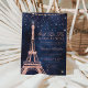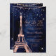 Un QUINCEAÑERA moderne, chic et glamour avec une parties scintillant en or rose dessinée à la main. Tour Eiffel à thème Paris avec parties scintillant en or rose, scintille sur un arrière - plan de quinceanera bleu marine foncé.