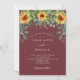 Un fond de couleur rouge vin, bordeaux décoré de tournesols et de verdure d'eucalyptus. Personnalisez et ajoutez vos noms et les détails de la fête.