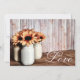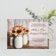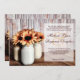pots de maçon peints, tournesols, tournesols, fleurs, florales, bois de grange, bois rustique, toile de jute, invitations de mariage campagnard, invitations rustiques de mariage