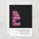 Conçu pour se coordonner avec notre collection de Neon Noir et Rose, ce faire-part de mariage comporte du texte néon "tout ce dont vous avez besoin est l'amour" sur arrière - plan noir. Parfait pour un mariage luisant néon amusant. Pour une personnalisation plus avancée de cette conception, par exemple la modification de la disposition, de la police ou de la taille du texte, cliquez sur le bouton "PERSONNALISER" ci-dessus. Veuillez me contacter pour toute question !