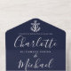 Le tout dans un seul faire-part de mariage avec l'ancre d'un navire, les noms de style signature et les initiales monographiques sur un arrière - plan bleu marine. L'invitation comprend une carte RSVP perforée avec votre code QR du site Web mariage et des détails. Conçu par Thisisnotme©