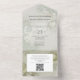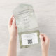 Ce design comprend un boho moderne simple destination un élégant sceau et envoie avec un site de code QR moderne en ligne, scannable URL scan informations invités, un élégant sceau et envoyer, triplé triple budget mariage, vert tropical feuille feuille, botanique plage océan côtier, avec aquarelle sauge feuillage vert, élégant minimaliste simple, un rustique classique calligraphie script police et emplacement photo pour belle image de couple.
