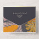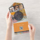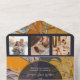 Un faire-part de mariage tout-en-un chic bohème unique en son genre, orangé et noir, avec une aquarelle abstraite et d'élégants accents dorés. Personnalisez ce design saisissant avec quatre photos personnalisées du couple, et incluez votre site Web et votre code QR pour faciliter RSVP et des détails supplémentaires. Vous n'avez pas besoin d'enveloppe, il suffit d'ajouter votre adresse de retour sur le rabat supérieur, sceller, et envoyer avec amour!