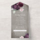 Cette invitation de mariage rustique gris présente une riche violette foncée et des roses roses rousses sur l'arrière - plan en bois gris avec des lampes à cordes brillantes. Parfait pour un mariage rustique. Toutes dans une seule invitation comprennent les infos du mariage et la carte postale RSVP que vos invités et envoyer. Profitez-en !