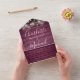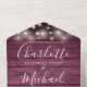Le tout dans un faire-part de mariage avec de jolies lampes à cordes, des noms de style signature et une typographie chic sur un arrière - plan en bois rustique bordeaux. L'invitation comprend une carte RSVP perforée avec un code QR. Conçu par Thisisnotme©