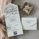 Cette calligraphie romantique code QR le mariage de tous dans une seule invitation est parfait pour un simple mariage. Le design classique moderne comprend des tourbillons fantaisistes et des fleurs fantaisistes avec une magnifique typographie élégante et lettrée à la main. Écrivez vos adresses d'invités à l'arrière de l'invitation pliée, ou achetez des autocollants de étiquette de adresse d'invités de coordination (vendus séparément).