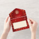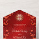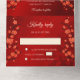 Cette faire-part de mariage tout-en-un présente un design chinois traditionnel avec des fleurs de cerisiers rouges et un double symbole de bonheur doré sur un arrière - plan chatoyant rouge. Les noms de mariée et de salle de classe sont écrits dans un script élégant et élégant.