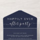 Élégante invitation de mariage ou d'annonce de mariage intime et de réception de mariage en bleu marine foncé et crème clair. "Happily Ever After Party" est écrit dans un mélange de typographie simple et d'un script élégant avec des fioritures. Entrez l'adresse URL de votre site web de mariage pour créer un code QR permettant à vos invités de répondre en ligne et d'obtenir des informations sur l'hébergement, les directions, les soirées de la veille et d'autres détails. Une carte postale de réponse détachable permet une réponse sans enveloppe de la part de vos invités qui préfèrent répondre par courrier.