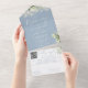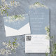 Le tout dans un faire-part de mariage bleu poussiéreux avec verdure botanique, lumières à cordes et typographie élégante. L'invitation comprend une carte RSVP perforée avec votre code QR du site Web mariage et des détails. Conçu par Thisisnotme©