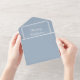 Invitation bleu poussiéreux tout-en-un mariage avec typographie élégante et initiales monographiques. L'invitation comprend un RSVP perforé avec votre code QR du site Web mariage et des détails. Conçu par Thisisnotme©