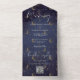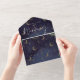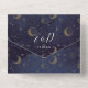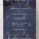 Cette faire-part de mariage tout-en-un présente une typographie élégante sur une lune céleste et des étoiles arrière - plan. L'invitation comprend une carte RSVP perforée avec votre code QR du site Web mariage. Conçu par Thisisnotme©