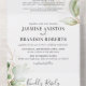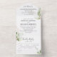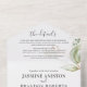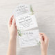 Élégant carton d'invitation triptyque 3 en 1 avec feuillage vert aquarelle botanique, accents de paillettes dorées, détails de votre mariage, invitation de mariage et carte postale de réponse pour le menu de repas à détacher et renvoyer à vos invités.