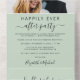 Elément vert sage chic ou faire-part mariage privé et invitation à la réception de mariage. Ce design présente votre photo "Happily Ever After Party" dans un mélange de typographie simple et d'un script élégant avec des swashes et une typographie moderne simple. Ajoutez vos noms dans un script de type signature. Une carte postale RSVP détachée fournit une réponse pratique sans enveloppe de vos invités.