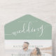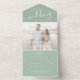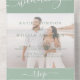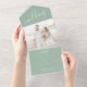 Invitation vos amis et les proches à votre mariage dans ce thème moderne élégant vert sauge tout en un mariage invitent dans une police de calligraphie simple. Écrivez les détails de votre mariage et remplacez la photo.