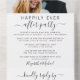 Élégant elopement ou faire-part de mariage privé combiné à une invitation de mariage pour annoncer votre mariage à la famille et aux amis et pour les invitation maintenant à une réception ou une fête post-mariage. Ce design présente votre photo et customisée faire-part de mariage et invitation à la réception, "Happily Ever After Party" dans un mélange de typographie simple et un script élégant avec des swashes. Entrez l'adresse URL de votre site Web mariage pour créer un code QR pour vos invités à RSVP en ligne et obtenir des informations sur l'hébergement, les itinéraires, toute nuit avant les parties et d'autres détails. Une carte postale RSVP détachée offre une réponse commode, écologique et sans enveloppe de la part de vos invités.
