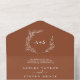 Ce mariage en terre cuite minime en feuille, tout en une seule invitation, est parfait pour un mariage boho. Le design se compose d'une simple silhouette de feuille de verdure orangée brûlée et minimaliste de style bohème désert. Écrivez vos adresses d'invités à l'arrière de l'invitation pliée, ou achetez les autocollants de étiquette de adresse d'invités de coordination (vendus séparément).