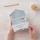 Boho faire-part de mariage présente des fleurs bleu et beige poussiéreuses et des feuilles séchés.
