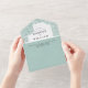 Le tout dans un faire-part de mariage à trois plis avec des fleurs d'art blanc sur un arrière - plan turquoise clair. combinaison faire-part de mariage, carte rsvp et enveloppe.