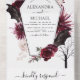 Halloween 31 Octobre Automne Automne Couleur d'eau foncée Bourgogne et Noir Mariage Invitations - comprend hantante et effrayante typographie de script élégant avec des Fleurs modernes, Araignées, Cobwebs et Bat Wings pour la célébration spéciale de mariage Déplaisant.
