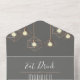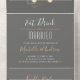 Un faire-part de mariage moderne et audacieux avec des lumières pendentifs géométriques et l'expression "Mange, Bois et Etre Marié". La couleur Arrière - plan peut être customisée pour correspondre à votre thème d'événement. Montré dans un gris foncé élégant.