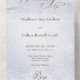 DISPONIBLE AVEC OU SANS CODE QR OU OPTIONS DE SÉLECTION DE DÎNER. Ce design se compose d'un simple arrière - plan en marbre bleu poussiéreux sous une douce couverture blanche et transparente. Le rabat arrière affiche les initiales de la mariée et du marié. Simple et élégant. Créé par Simply Farmhouse Press.
