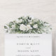 Cette faire-part de mariage tout en un capte l'essence d'un jardin botanique avec son élégant entonnoir floral, avec des tons de porcelaine blanche et une variété de verdure, de la menthe à la sauge, enveloppant des roses blanches intemporelles. L'invitation est conçue pour la commodité avec une carte postale RSVP détachée, alliant harmonieusement fonctionnalité et la délicate beauté de la nature. Un arrière - plan gris doux fournit une toile neutre qui accentue les verts vibrants et les blancs doux du design floral. Parfait pour les couples à la recherche d'une façon sophistiquée et écologique de gérer leurs invitations de mariage et leurs réponses.
