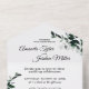 Ce mariage botanique neutre, tout en une seule invitation, offre un palais plante simple et rustique pour se coordonner avec n'importe quel thème mariage traditionnel. La verdure minimale, aux tons gris et foncés d'élégants feuilles d'eucalyptus verts et de feuillage plante, à côté de la calligraphie décontractée classe, ouvre une ambiance de nature minimaliste à une célébration classique et formelle du mariage.