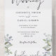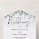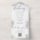 Invitation de mariage tout-en-un avec verdure florale et typographie élégante. L'invitation comprend une carte RSVP perforée qui présente le code QR du site Web de votre mariage. Conçu par Thisisnotme©