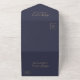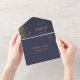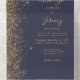 Le bord gauche de cette élégante faire-part de mariage tout-en-un moderne et RSVP est orné d'une bordure de parties scintillant en faux or. Le texte personnalisable combine écriture fantaisie dorée, copperplate et polices italiques sur un arrière - plan bleu foncé. L'adresse de retour apparaît sur le rabat extérieur et sur le côté arrière de la carte RSVP détachable en texte doré sur bleu foncé solide.