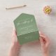 Ce simple mariage vert sauge solide, tout en une invitation, est livré avec une carte RSVP détachable et présente une élégante typographie blanche pour une cérémonie en plein air dans un cadre naturel. Script minimaliste sur un invitation vert clair paisible pour un lieu rustique en dehors d'une forêt d'arbres.