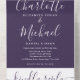 Le tout dans un faire-part de mariage avec un élégant nom de script signature et des initiales monogrammes sur un arrière - plan violet. L'invitation comprend une carte RSVP perforée qui peut être adressée individuellement ou laissée vide pour que vous puissiez écrire à la main les coordonnées de votre invité. Conçu par Thisisnotme©