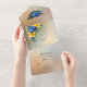 Un mariage élégant triple en une seule invitation faite dans une couleur or. Une zone encadrée pour le texte personnalisé est bordée de jolis graphiques de fleurs d'iris bleu et jaune. Des produits mariages correspondants sont disponibles.