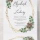 Ce design présente un cadre géométrique doré décoré de cônes de pin aquarelle et de verdure hivernale, notamment d'eucalyptus et de feuilles saints. Personnalisez-le avec les noms de la mariée et du marié dans le script de calligraphie stylisé. Idéal pour un mariage à thème hiver ou Noël. L'extérieur de la carte est une teinte de vert massif assortie.