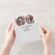 Une belle aquarelle tout-en-un avec les visages d'une mariée et d'un marié portant des masques faciaux vénitiens dans les tons faux or, bleu, rose et rouge. Un deuxième masque oculaire apparaît en bas et un troisième sur le rabat arrière. Tous les masques sont dans les mêmes teintes et sont placés contre un arrière - plan blanc qui a éditable des modèles de texte noir sur lui. Ce graphique en aquarelle est idéal pour un mariage ou un mariage de thème masqué masqué. Le tiers inférieur a une carte de réponse déchirante avec adresse rsvp personnalisée pour vos invités à compléter.