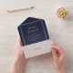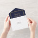 Mariage tout-en-un invitation bleu marine et or avec élégante typographie et initiales monogrammes. L'invitation comprend une carte RSVP perforée qui peut être adressée individuellement ou laissée vide afin que vous puissiez écrire à la main les coordonnées de votre invité. Conçu par Thisisnotme©