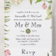 Faire-part de mariage verdoyant tendance avec monographie cristalline dorée et encadrée géométrique.