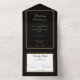 Invitation tout-en-un mariage en noir et or avec une élégante typographie et des initiales monographiques. L'invitation comprend une carte RSVP perforée qui peut être adressée individuellement ou laissée vide pour que vous puissiez écrire à la main les coordonnées de votre invité. Conçu par Thisisnotme©