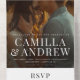 Une superposition de type moderne avec de grands noms et une photo de fond plein sont les caractéristiques sur tout cela dans un seul faire-part de mariage avec la carte de réponse déchiré.