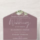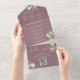 Le tout dans un seul faire-part de mariage avec le nom des parents, des feuilles botaniques verdoyants rustiques et une typographie élégante sur un arrière - plan mauve. L'invitation comprend une carte RSVP perforée avec un code QR. Conçu par Thisisnotme©