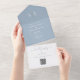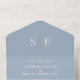 Cette faire-part de mariage tout-en-un minimaliste chic peut être personnalisée avec vos initiales monogrammes et informations de mariage sur un arrière - plan bleu poussiéreux. L'invitation comprend un RSVP perforé avec votre code QR du site Web mariage et des détails. Conçu par Thisisnotme©
