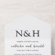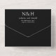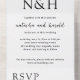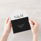 Moderne tout en un faire-part de mariage avec un design simple et minimal noir et blanc avec votre monogramme en caractères gras avec vos noms dans un élégant script d'écriture manuscrite.